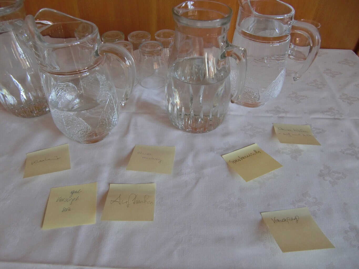 Im nächsten Schritt schreiben die Teilnehmenden kurze Aussagen auf Post-its. Dabei können Beobachtungen festgehalten werden wie: „Hier spricht jemand von vorne.“, „Dieser Platz wirkt einladend.“, „Hier fehlt Blickkontakt.“ oder „Die Technik bestimmt die Aufmerksamkeit.“