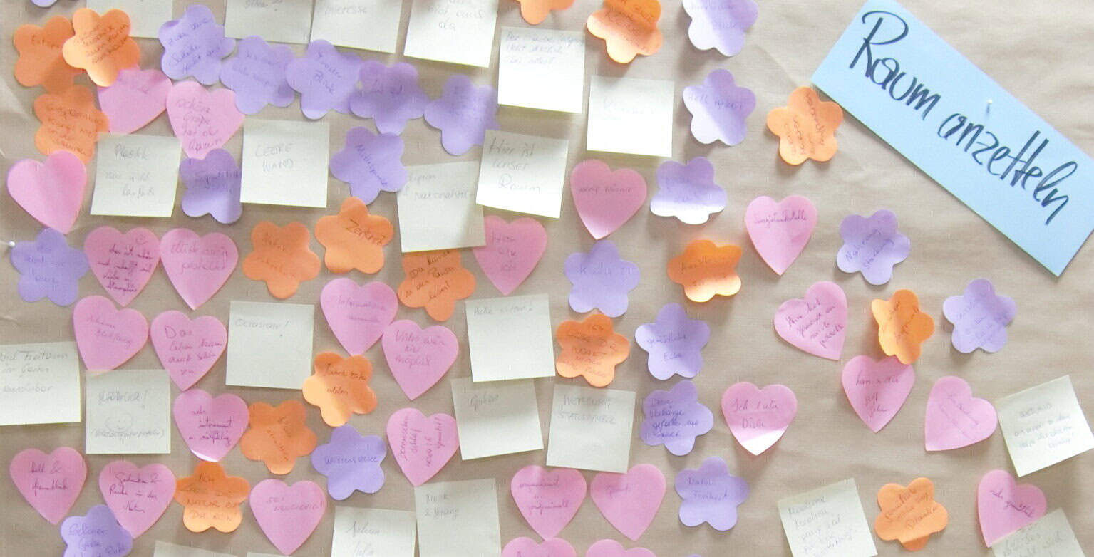 Die Gruppe betrachtet anschließend gemeinsam den „angezettelten“ Raum. Dabei wird reflektiert, welche Botschaften besonders häufig auftauchen, wo sich Hierarchie zeigt, wo Beteiligung entsteht und was die Gruppe überrascht.
